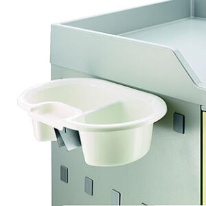 Posuda za odlaganje medicinskih instrumenata izrađena je od sintetičkih materijala i praktičnog je dizajna. Dostupna je sa zatvorenim poklopcem ili s prorezanim poklopcem. Može se sterilizirati i višekratna je. Ova polipropilenska posuda sa zatvaračem dolazi u dimenzijama od 300 x 225 x 125 mm i brzo se te jednostavno montira na bočnu stijenku kolica. Čvrsto prianja i lako se otvara te koristi za odlaganje.